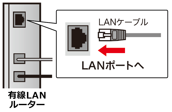 お使いの有線LANルーターのLANポートに、LANケーブルをつなぎます。