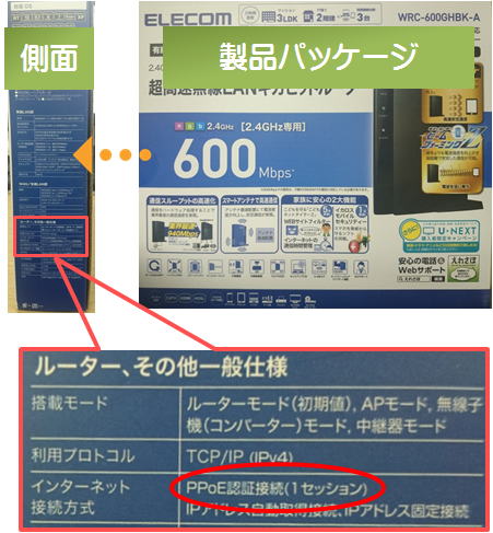 ※製品パッケージ側面の【ルーター、その他一般仕様】にある【インターネット接続方式】の記載が、