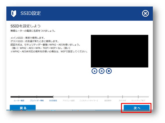 メインのSSIDとパスワードを、半角英数字で入力後、「次へ」をクリックします。
