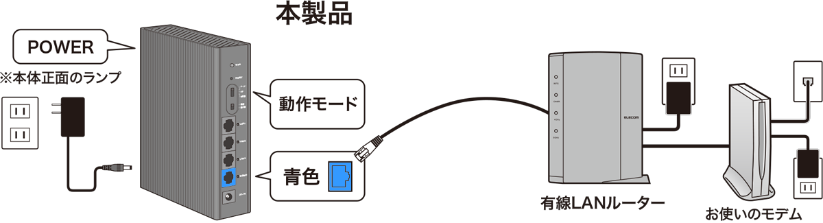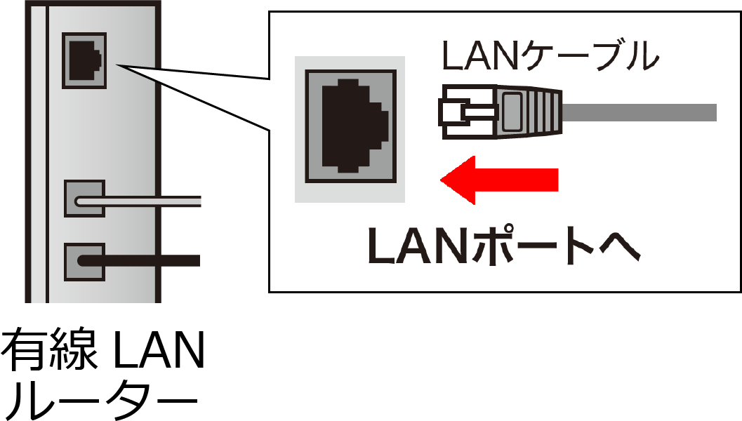 お使いの有線LANルーターのLANポートに、LANケーブルをつなぎます。