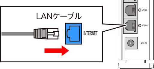 「2」でつないだLANケーブルのもう片方を、本製品の背面にある INTERNET と表示された挿し込み口につなぎます。
