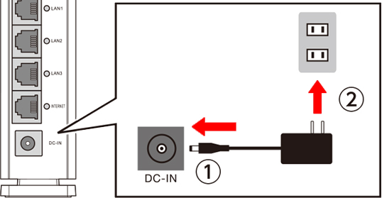 本製品にACアダプターをつなぎ、続いてコンセントに接続します。(この動作で電源が入ります)
