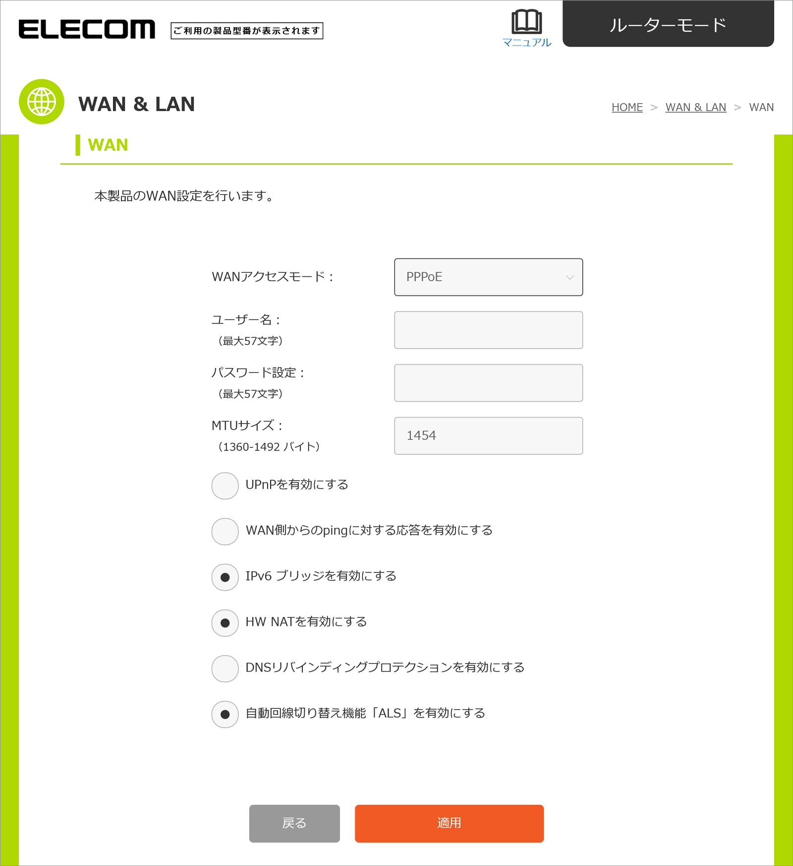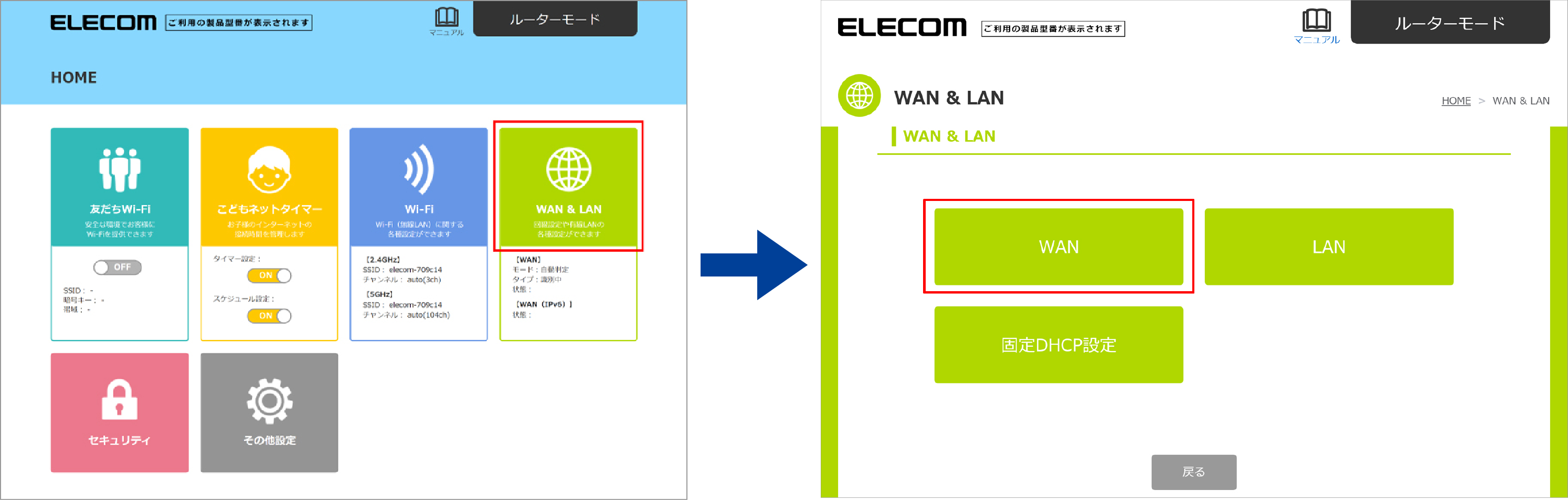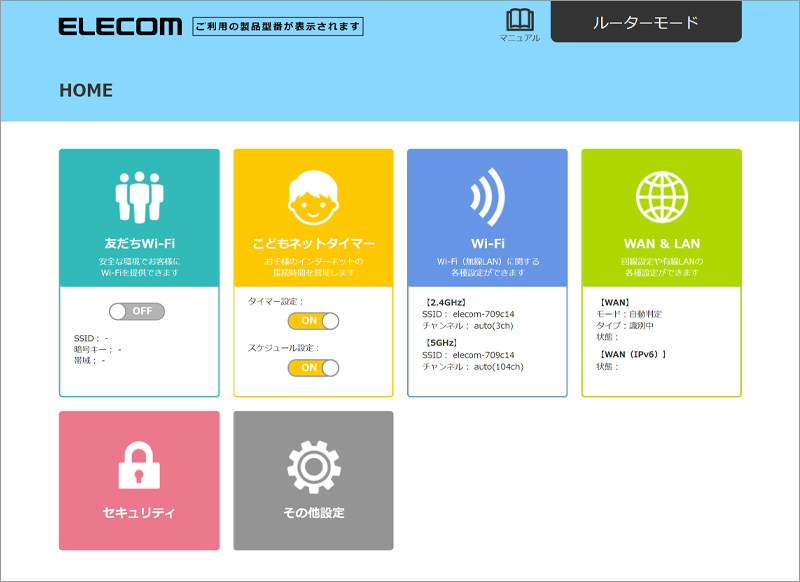 初期設定時に選択された「WANアクセスタイプ」により画面が異なります。